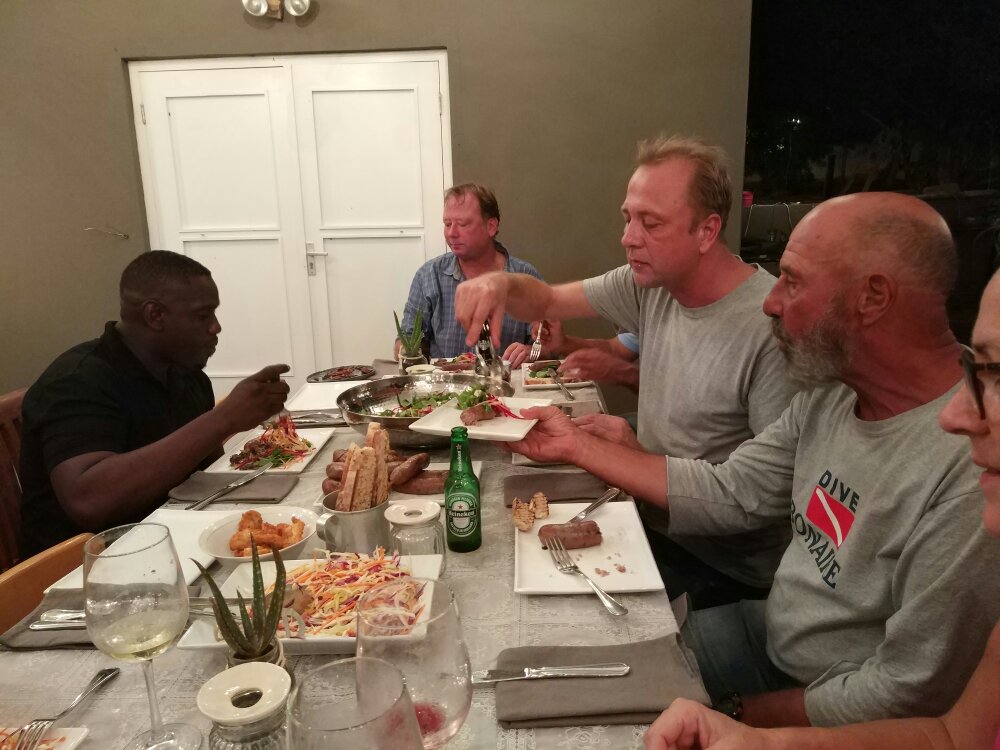 Wij deden het netjes, mede gezien de geringe inhoud van de kofferbak van de huurkia, en hadden een geit met een oormerk tot onze beschikking. Henk, slager maar tegenwoordig commercieel directeur bij groothandel DeliNova, beende het beestje vaardig en welbespraakt uit. Althans, een half leven op het eiland, maar zijn Drentse accent zat er nog goed in. ’t Was een prachtbeest. Met zijn 20 kg eigenlijk voldoende voor de 20 deelnemers, maar er was voor ons ook nog een wild zwijnje geschoten. Een klein en tamelijk schriel beestje, zoals ze hier op het eiland in grote getale rondlopen. Buikspek buikschmeck. Met 20 man maakten we van de twee beestjes worst, pate, jerky, gestoofd kopvlees, carribean ‘cabritu’ spareribs, gebakken hart, bout van de BBQ en nog veel meer. Het was een topavond.