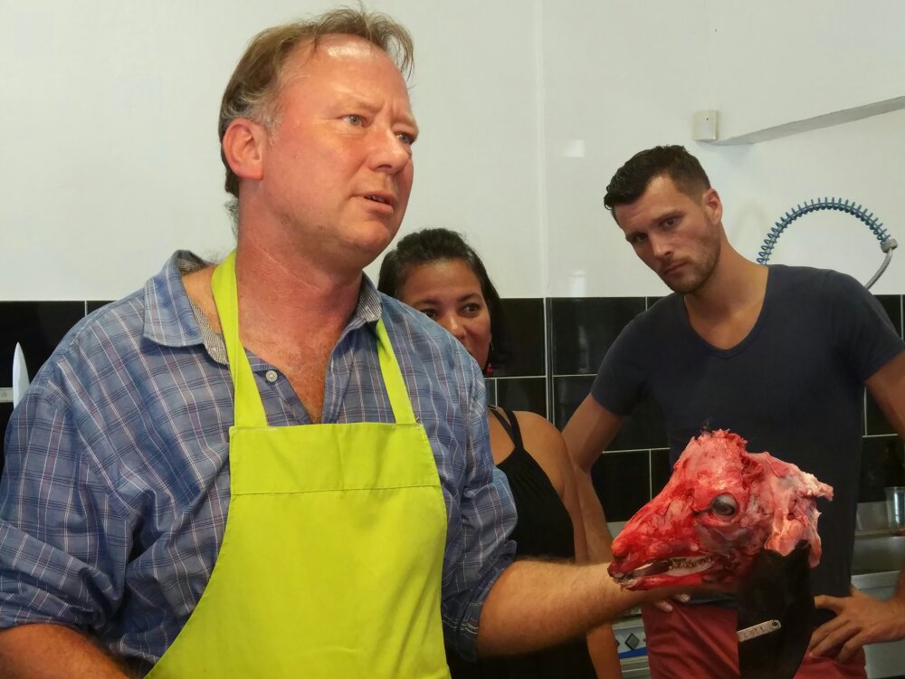 Vijf workshops geeft meneer hier op het prachtige eiland, elk met een lokale twist. Worsten van zelfgeschoten duifjes, gerookte leguaan en kop tot staart met een lokaal wild zwijn en geit.