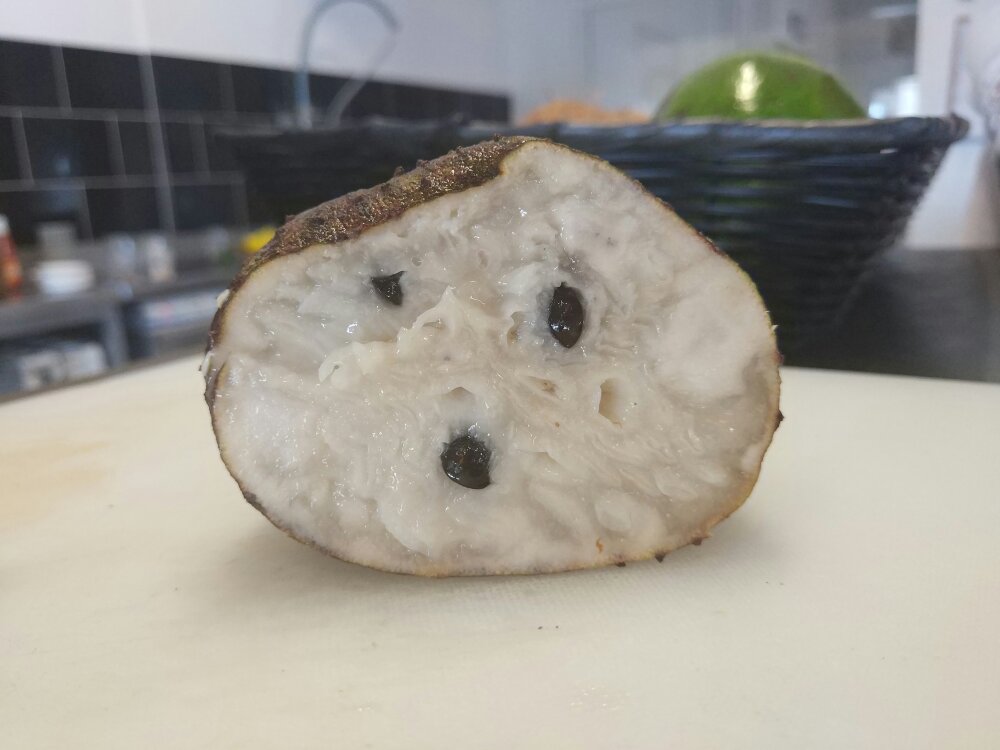 Deze van buiten en van binnen tamelijk onooglijke vrucht is zo lekker dat je denkt dat hij uit de fabriek komt. Meneer kende hem alleen als bevroren puree, en niet vers. Hij houdt zich aanbevolen voor versvindplaatsen in de regio Amsterdam (wildplukwijzer?). De pitten zijn niet eetbaar.